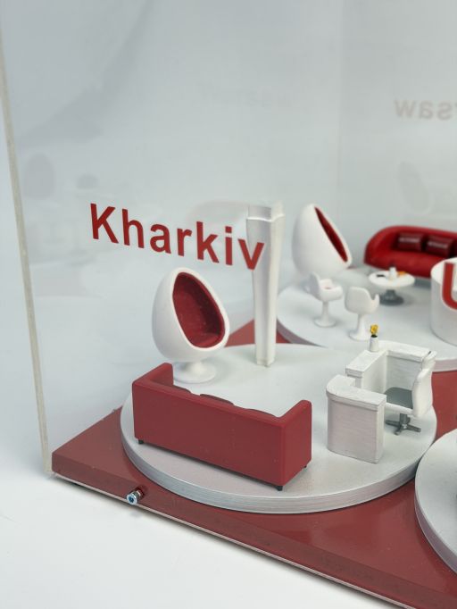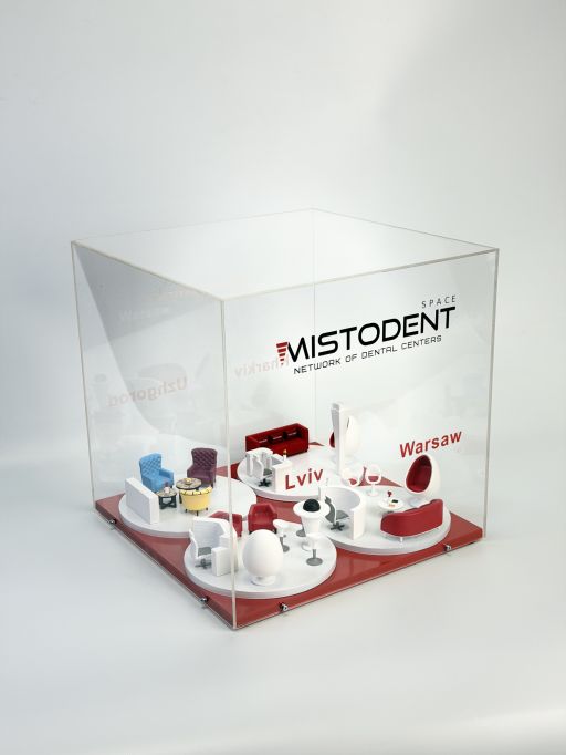 Створили презентаційний макет у акриловому кубі для мережі стоматологічних центрів MISTODENT. Завданням було виготовити ефектний, акуратний експонат для демонстрації бренду — з деталізованими елементами інтер’єру, чистим фінішем і чіткими написами.